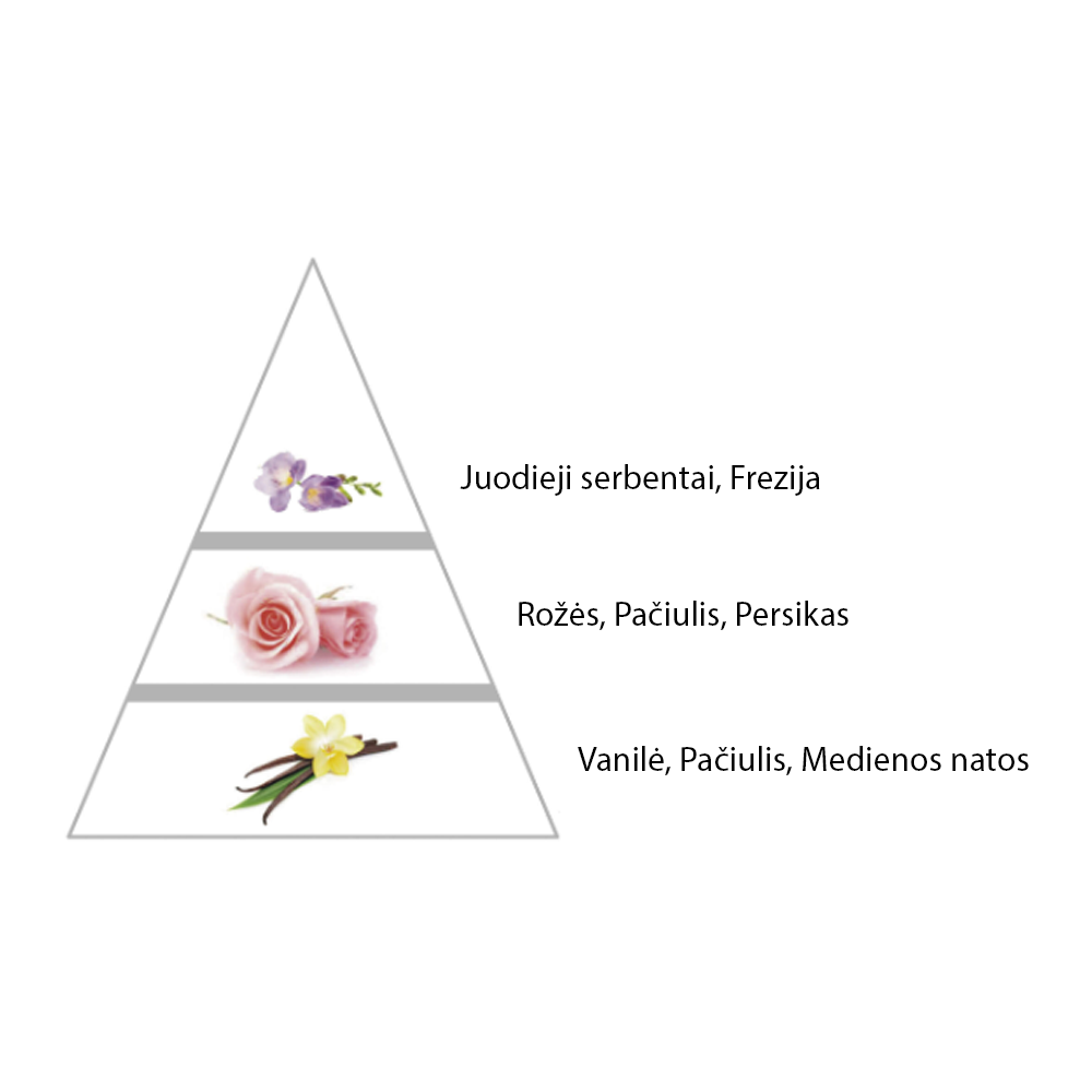 Kvepia kaip: 🫐 Juodieji serbentai + 🌸 Frezija + 🌹 Rožė + 🌿 Pačiulis + 🍑 Persikas + 🍦 Vanilė + Šviesi mediena