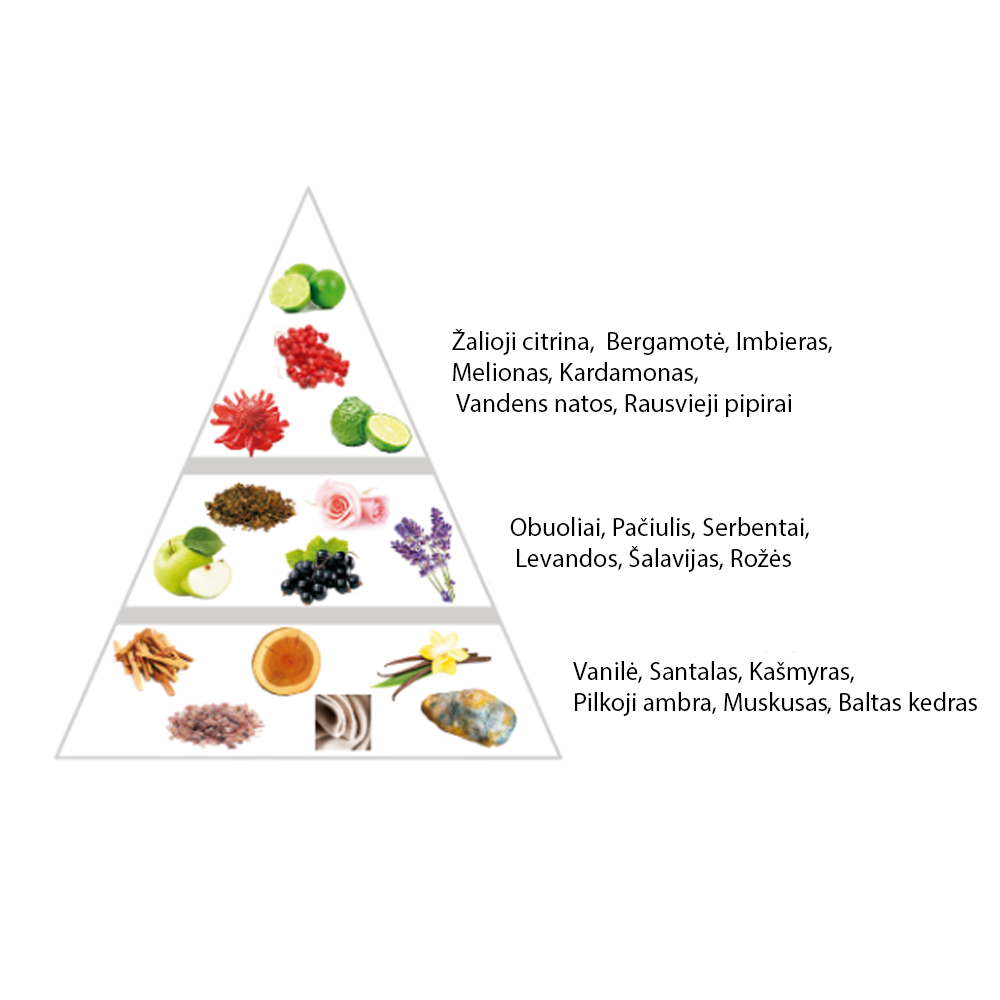 Kvepia kaip: 🍋 Citrina + 🍊 Bergamotė + 🍏 Obuolys + 🍦 Vanilė + 🌿 Pačiuliai + 🪵 Sandalmedis + 🧡 Gintaras + 🪵 Kašmyro mediena
