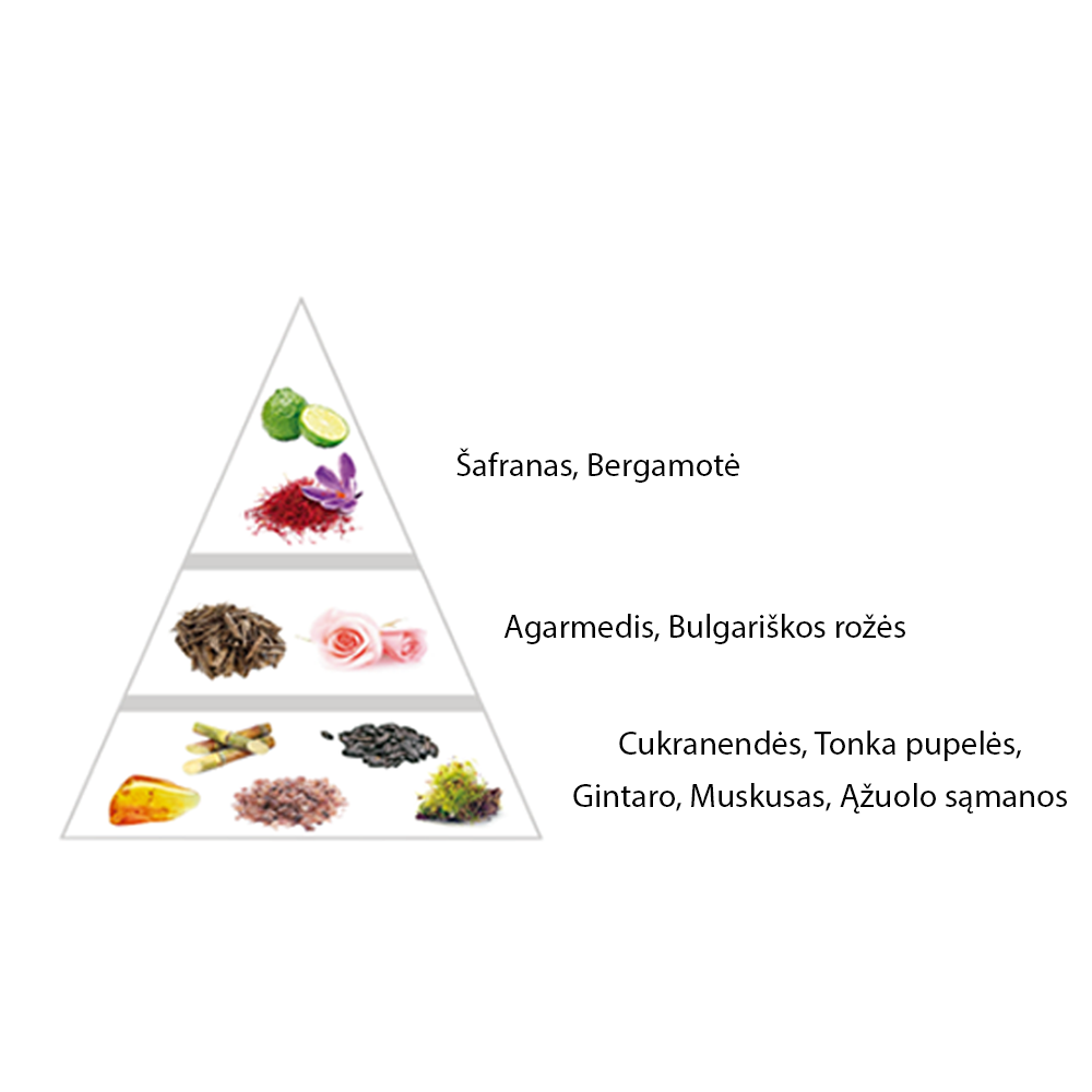 Kvepia kaip: 🌿 Šafranas + 🍊 Bergamotė + 🌲 Oud mediena + 🌹 Bulgariška rožė + 🍬 Cukranendrės + 🌰 Tonka pupelės + 🧡 Gintaras + 🌿 Baltasis muskusas + 🌳 Ąžuolo samanos.